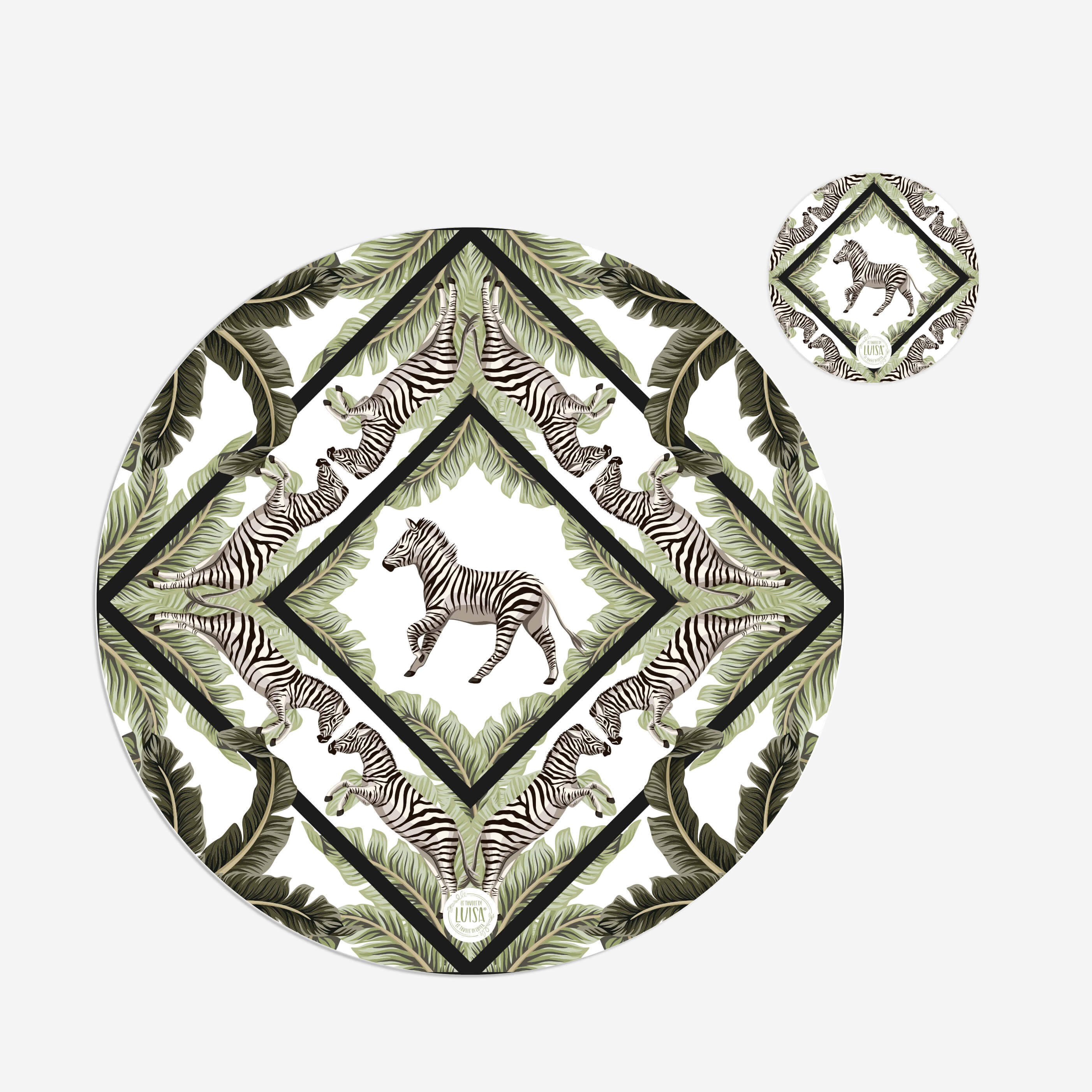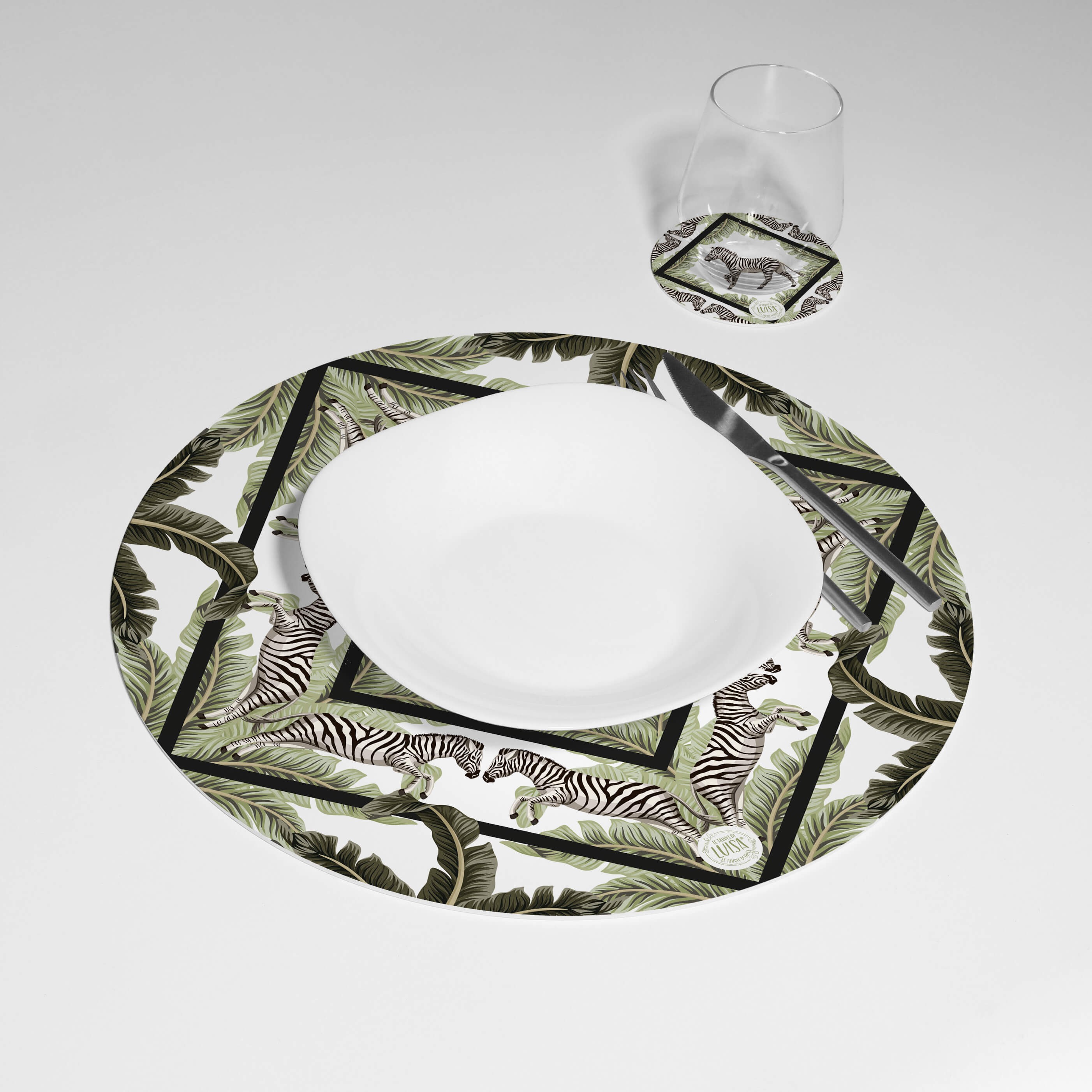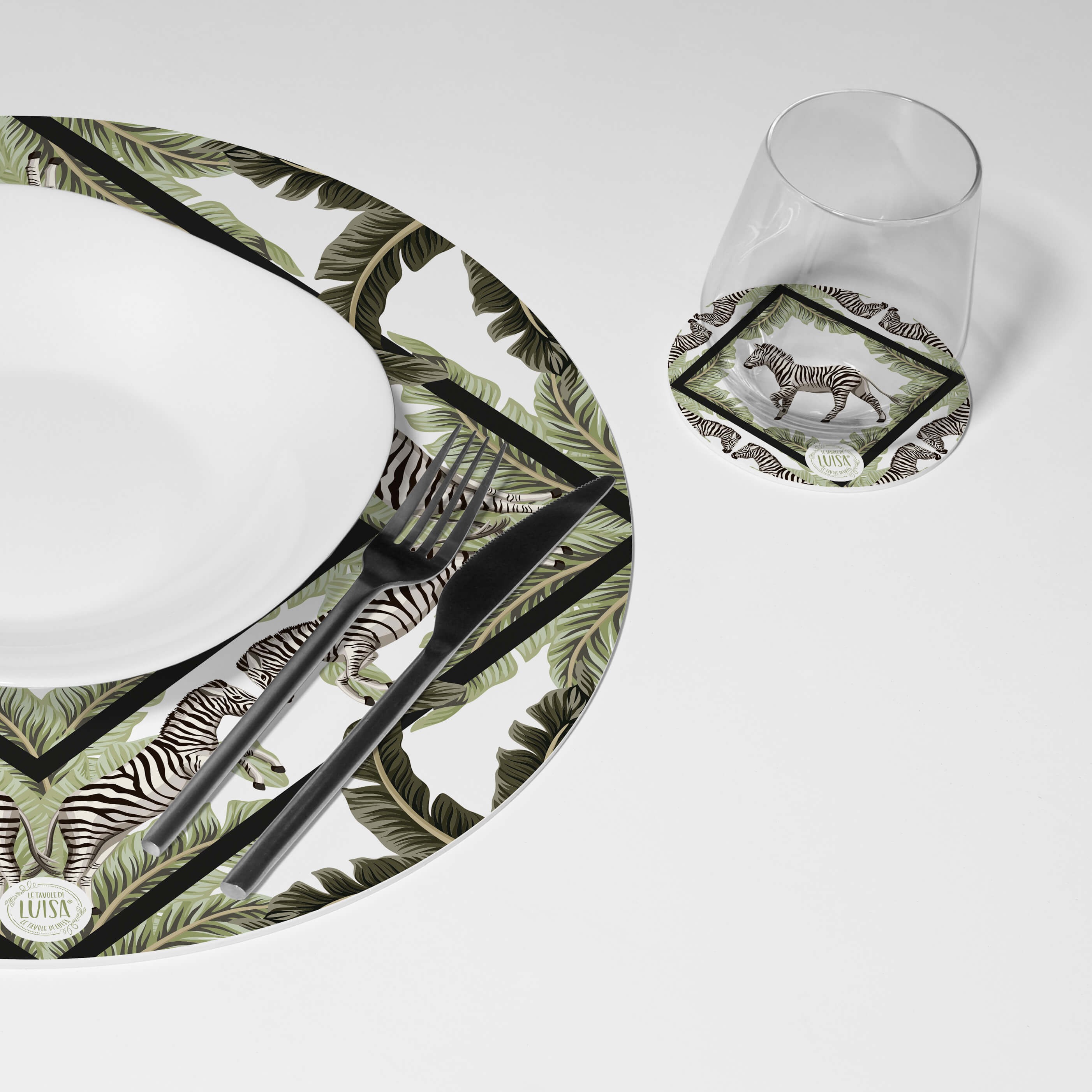 Kit 6 sottopiatti e 6 sottobicchieri “Zebre”, Collezione Kit sottopiatti con sottobicchieri - Le Tavole di Luisa