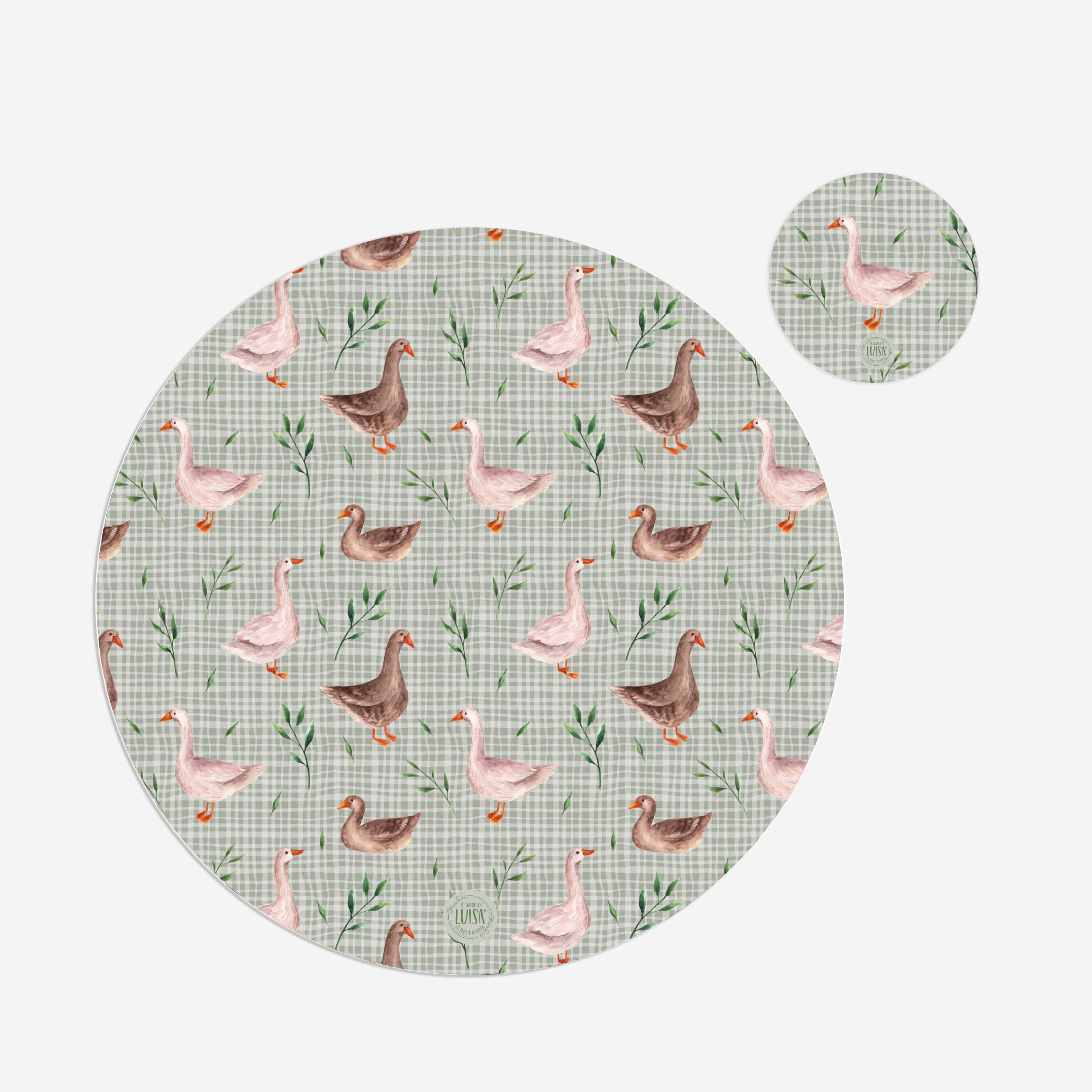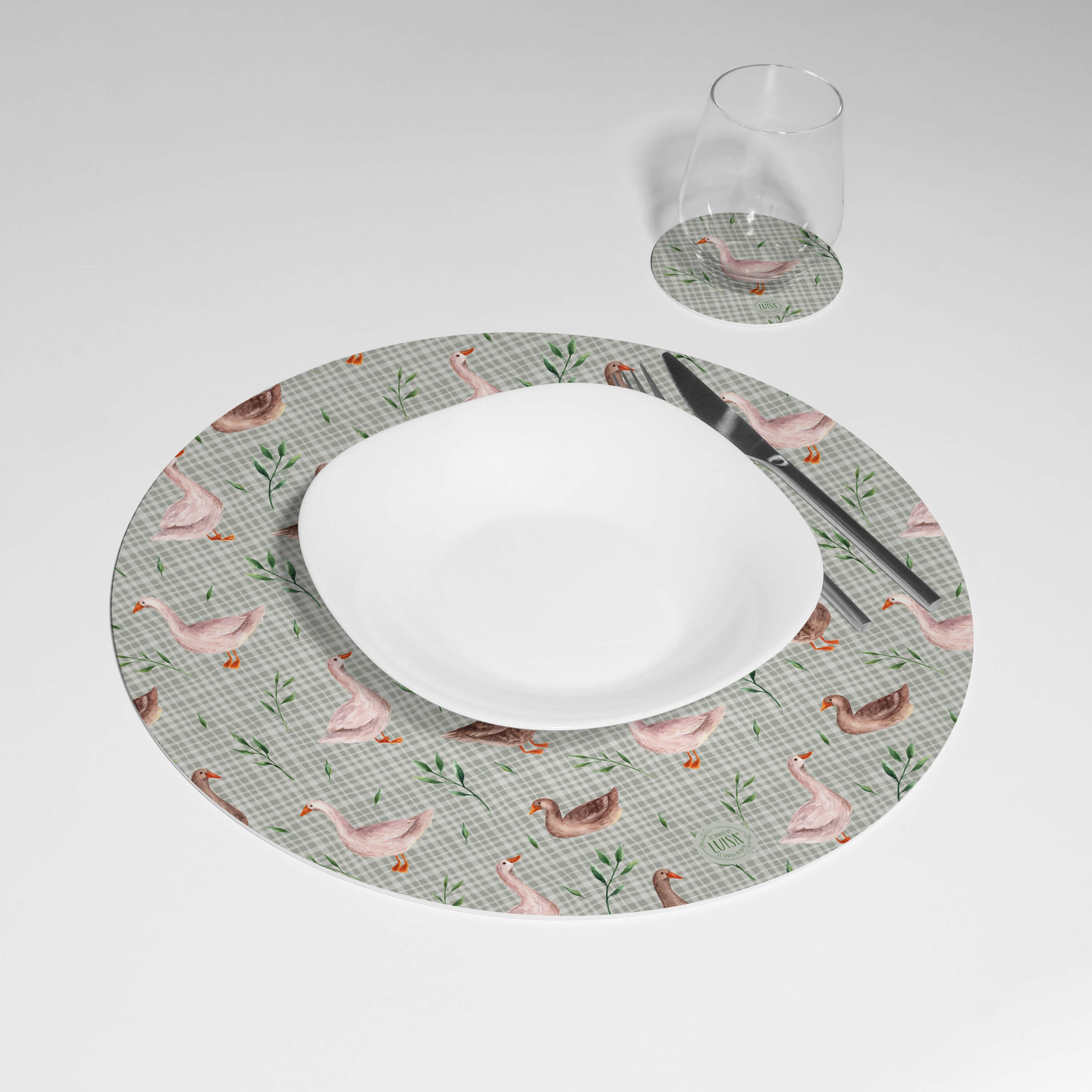 Il design accurato, che fonde eleganza e semplicità, trasforma la tavola in un paesaggio campestre, ideale per chi ama gli ambienti accoglienti e familiari. L'immagine delle oche, fedele alla realtà, si sposa perfettamente con lo sfondo a quadretti, creando un equilibrio visivo che ricorda le tradizioni agresti.