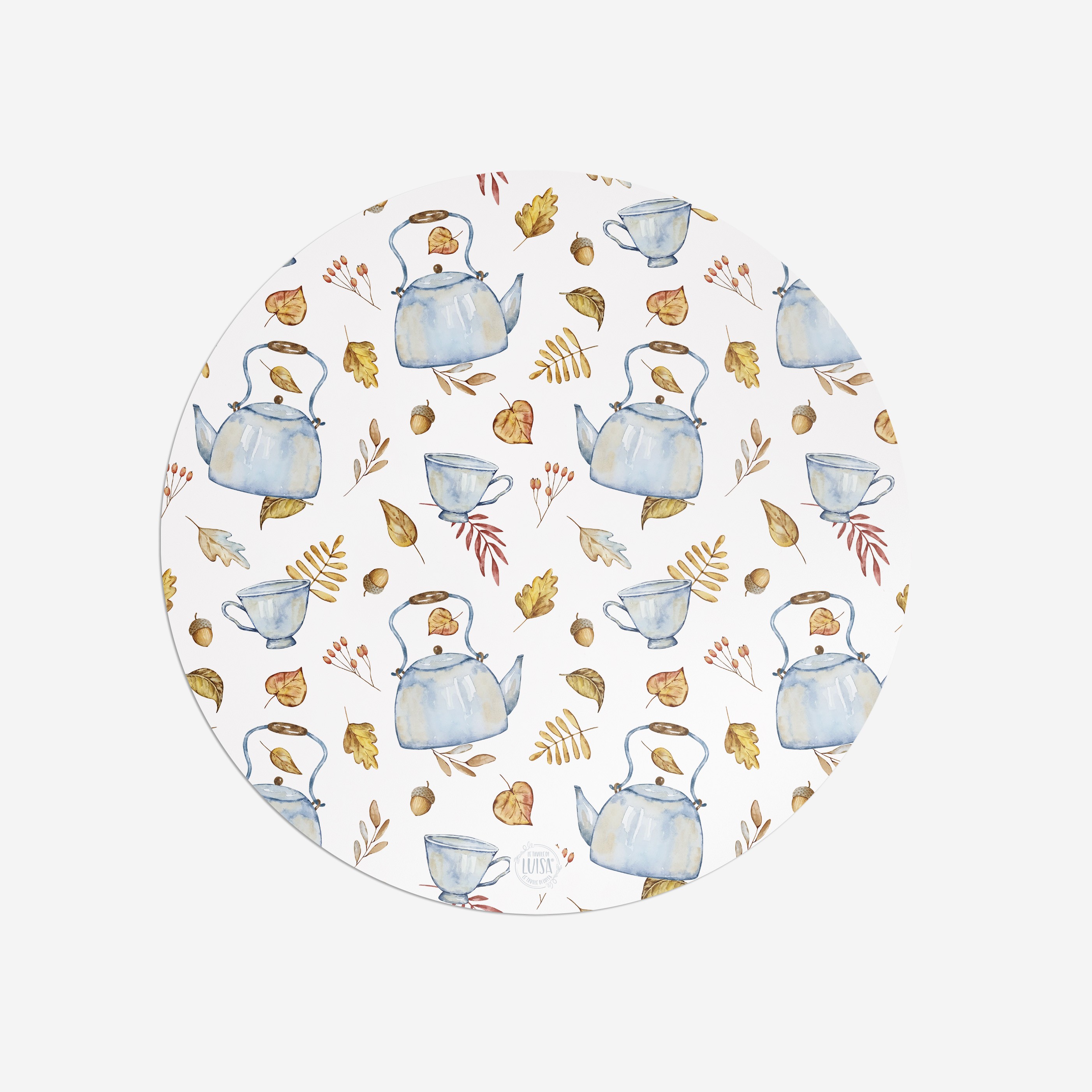 Trasforma la tua tavola in un dolce quadretto autunnale con questo set di sottopiatti in PVC semirigido. Ciascun sottopiatto incanta con un motivo autunnale disegnato che celebra la bellezza e la serenità dell'autunno. Una teiera elegantemente stilizzata, una tazza di tè e foglioline giocose si alternano armoniosamente, creando una scena incantata che evoca il calore delle giornate autunnali.