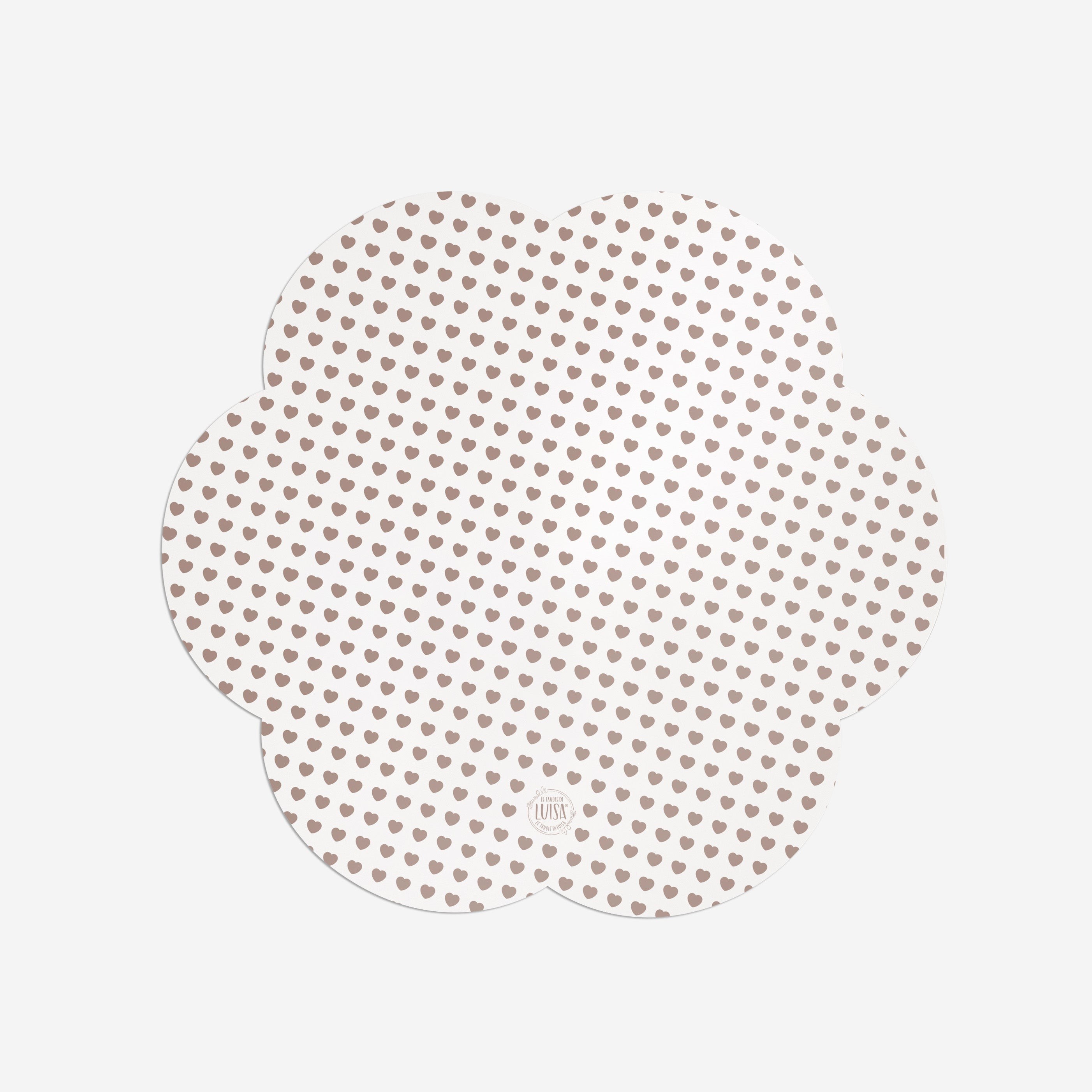 Un pattern di piccoli cuori beige su fondo chiaro. Sottopiatti di qualità, che possono accompagnare qualsiasi allestimento. Dal più semplice, al più ricco.