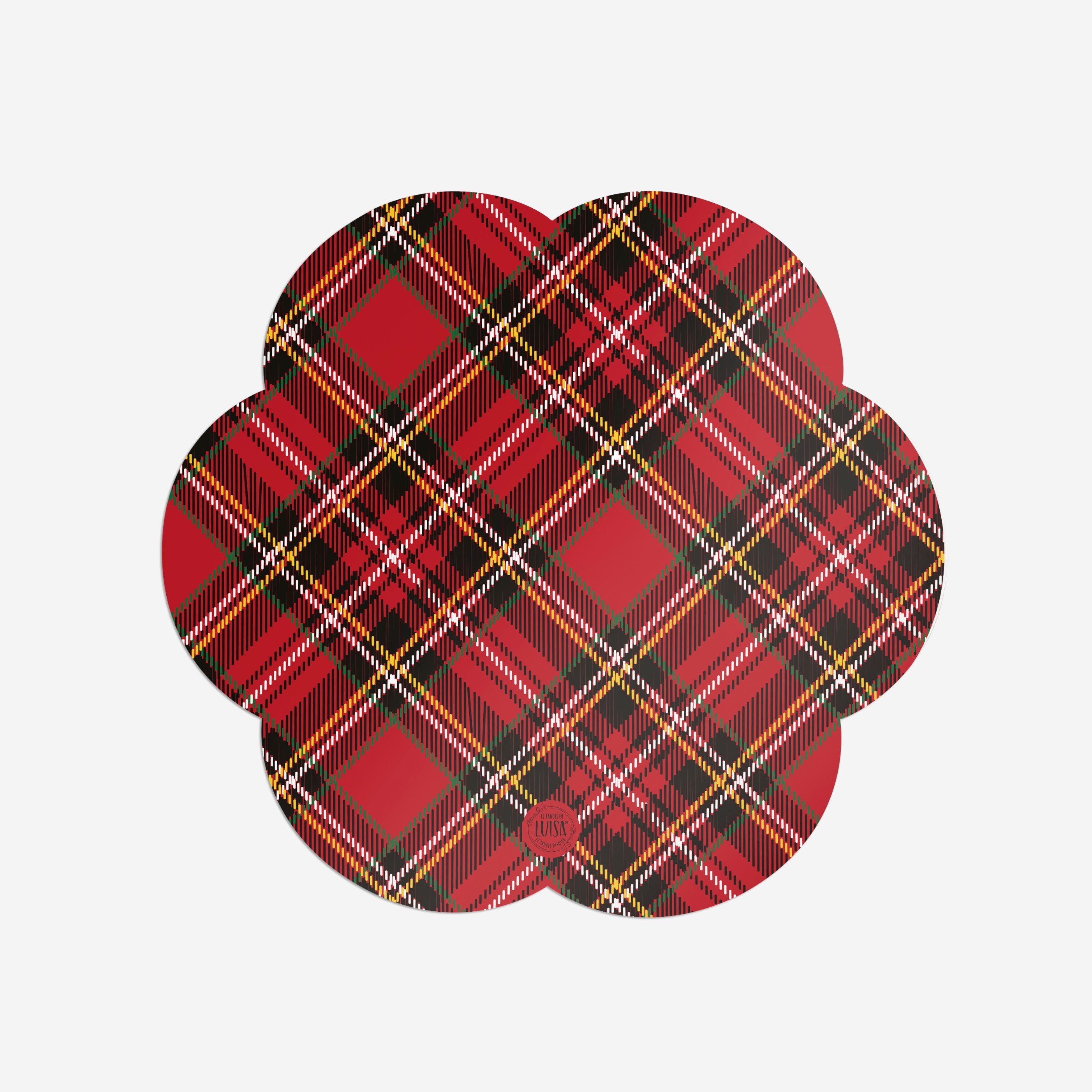 Sottopiatti in materiale plastico semirigido, lavabili e riutilizzabili, stampati con la riproduzione della più classica stoffa scozzese: il tartan rosso con contrasti neri.