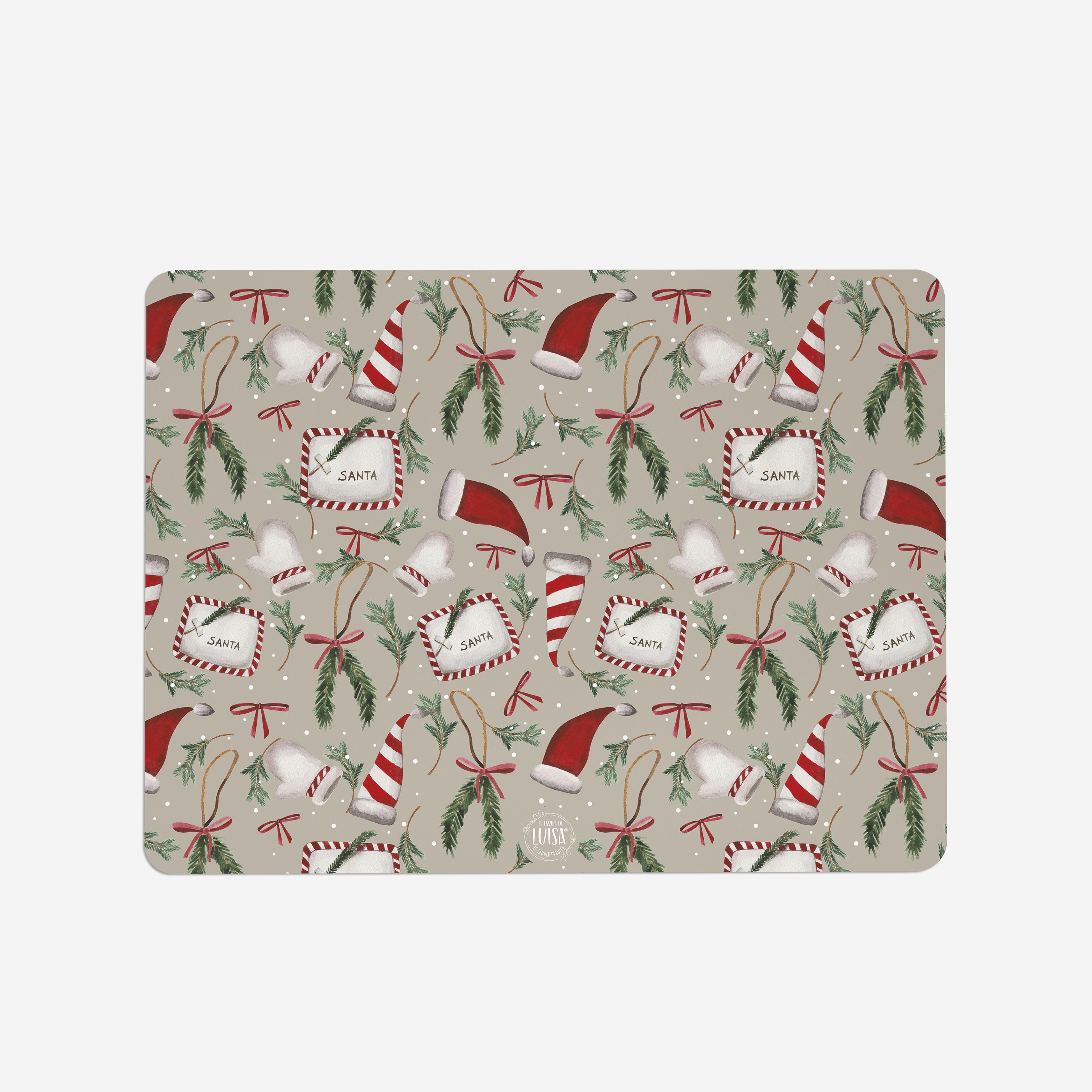 Celebra il Natale con il calore delle festività direttamente sulla tua tavola grazie a questi sottopiatti in PVC semirigido. Ogni sottopiatto è decorato con un incantevole motivo natalizio che richiama Babbo Natale: il suo iconico cappello rosso, i guanti, tante letterine per Santa Claus e rami di agrifoglio su uno sfondo chiaro. Questo stile artistico cattura la magia del periodo natalizio e aggiunge un tocco di festa unico alle tue cene conviviali.