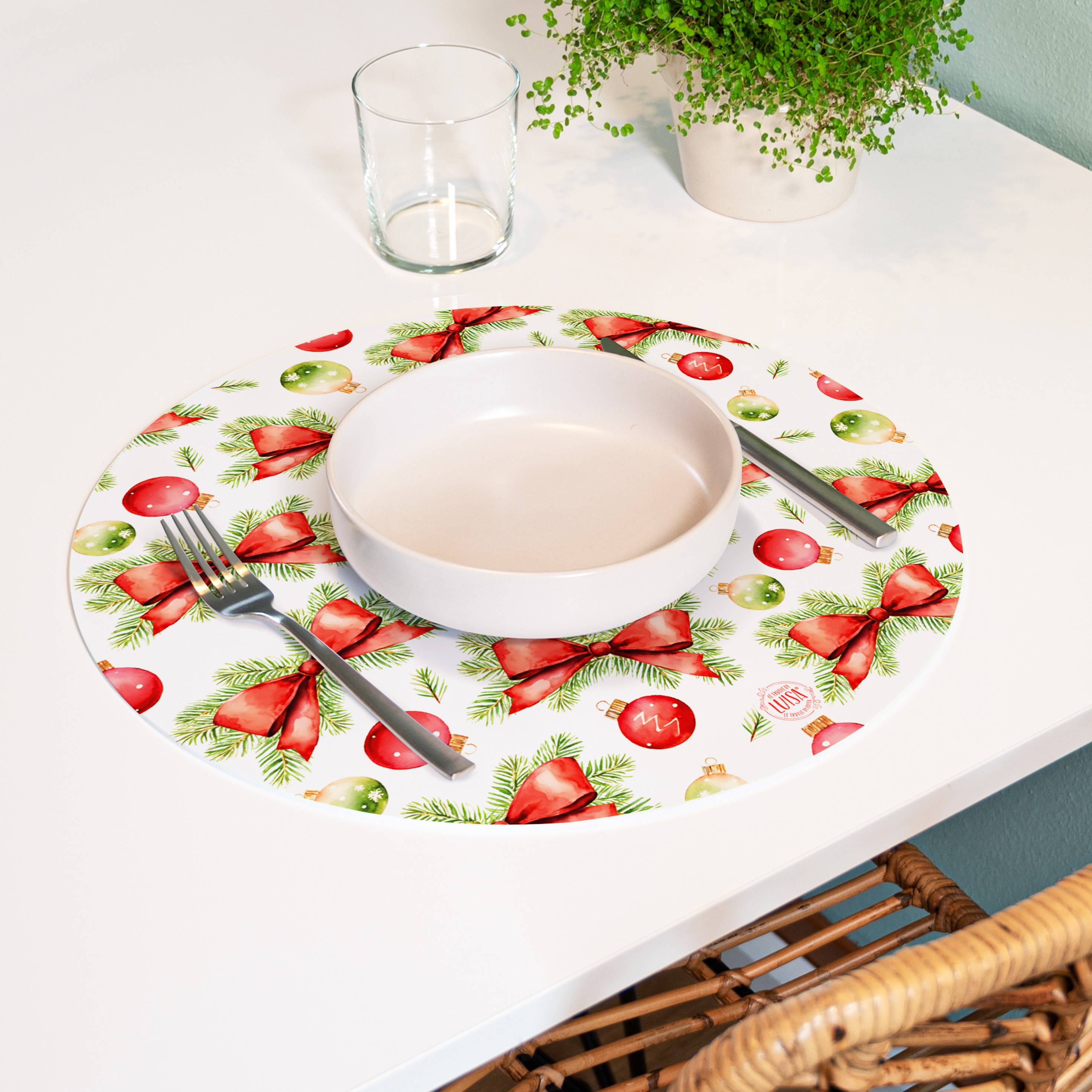Porta l'allegria delle festività sulla tua tavola con questo set di sottopiatti. Ogni sottopiatto è un inno alla gioia del Natale, con un motivo vivace e festoso che presenta fiocchi, decorazioni scintillanti per l'albero di Natale e foglioline verdi.