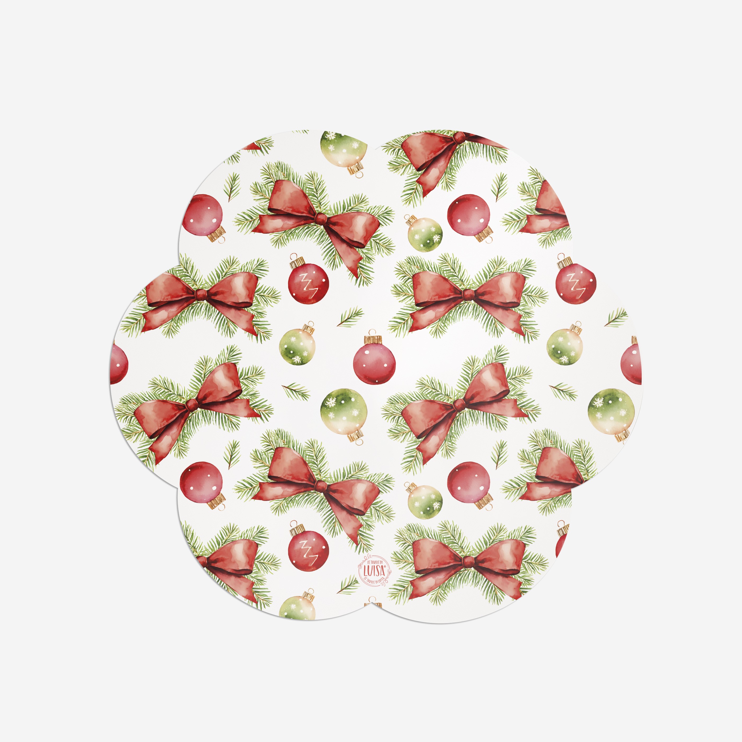 Porta l'allegria delle festività sulla tua tavola con questo set di sottopiatti. Ogni sottopiatto è un inno alla gioia del Natale, con un motivo vivace e festoso che presenta fiocchi, decorazioni scintillanti per l'albero di Natale e foglioline verdi.