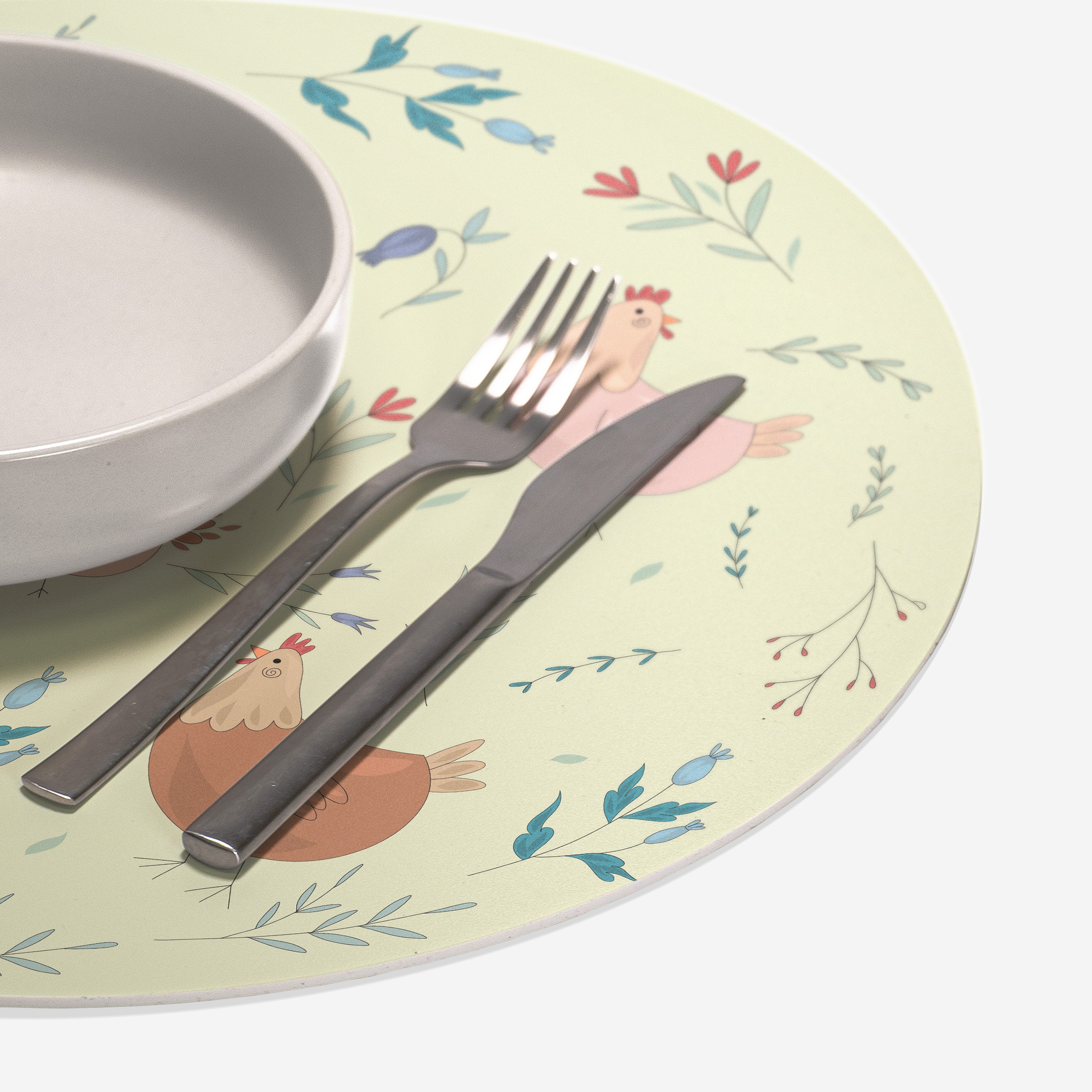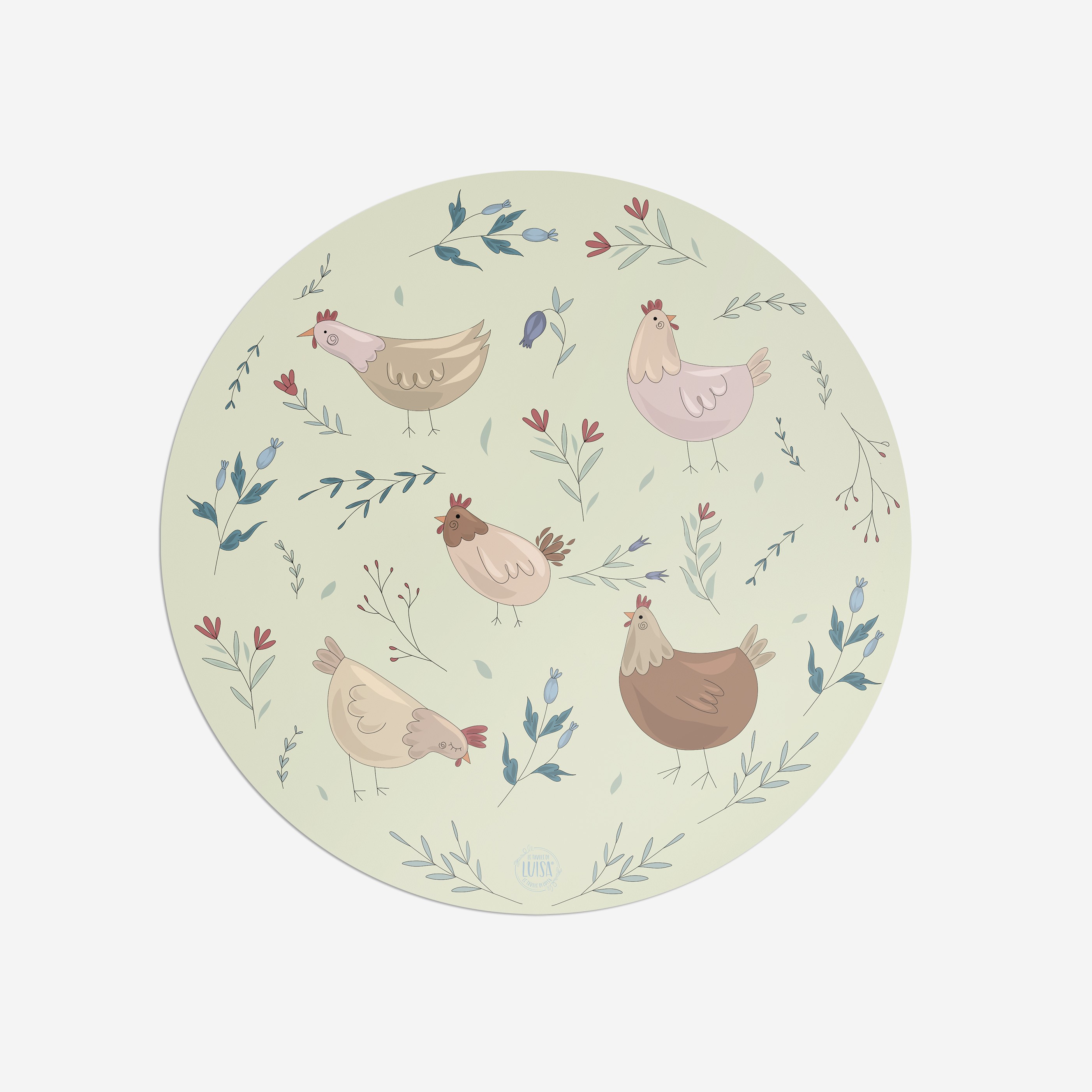 La stampa sulla superficie è divertente e simpatica, caratterizzata da una varietà di galline che razzolano in un prato erboso su uno sfondo verde.