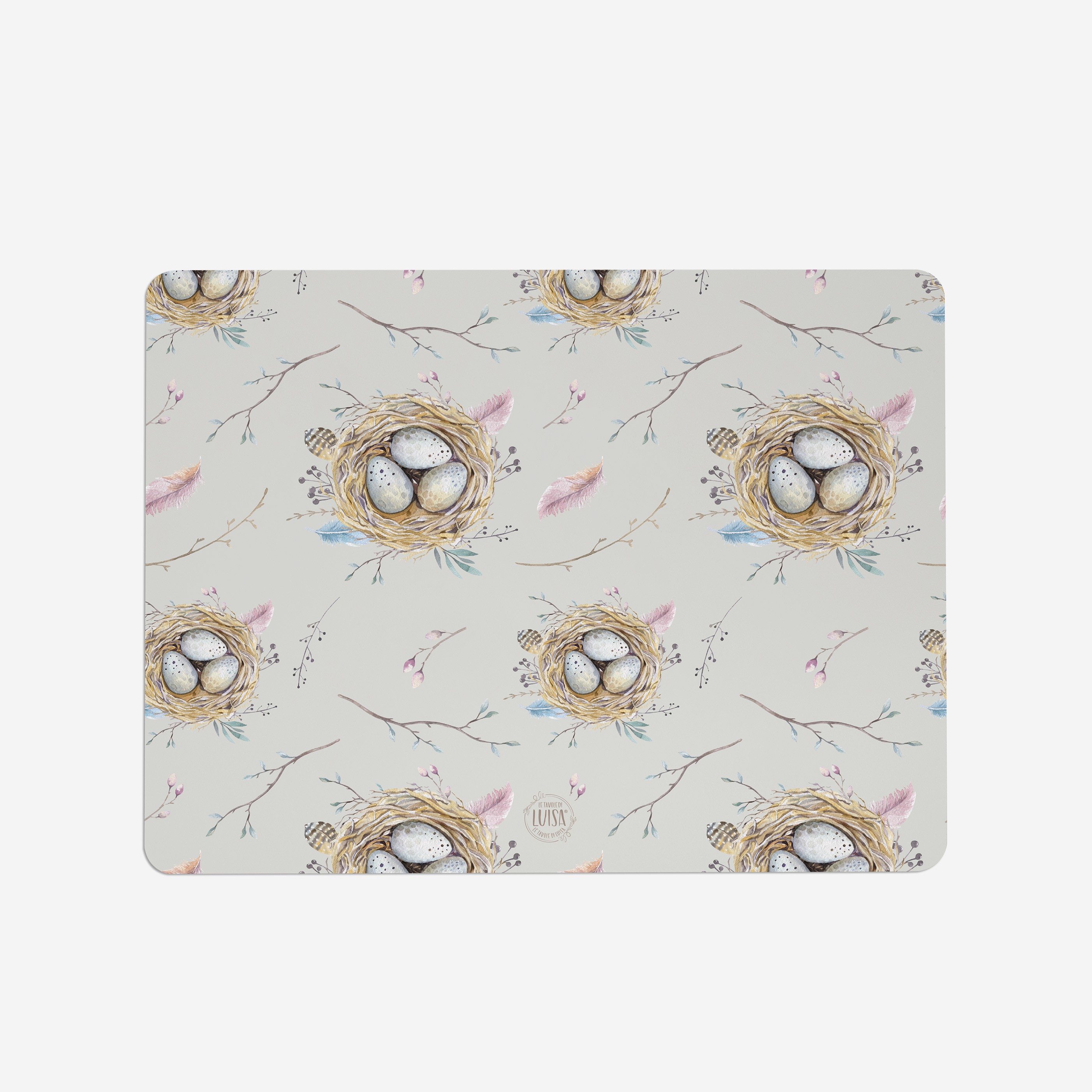 Nella cultura cristiana, l'uovo è un simbolo molto importante della Pasqua, in quanto rappresenta la rinascita, la vita nuova e la speranza. Questi sottopiatti presentano una stampa con un disegno naturalistico di uova all'interno di tanti nidi d'uccello, pronte per schiudersi.