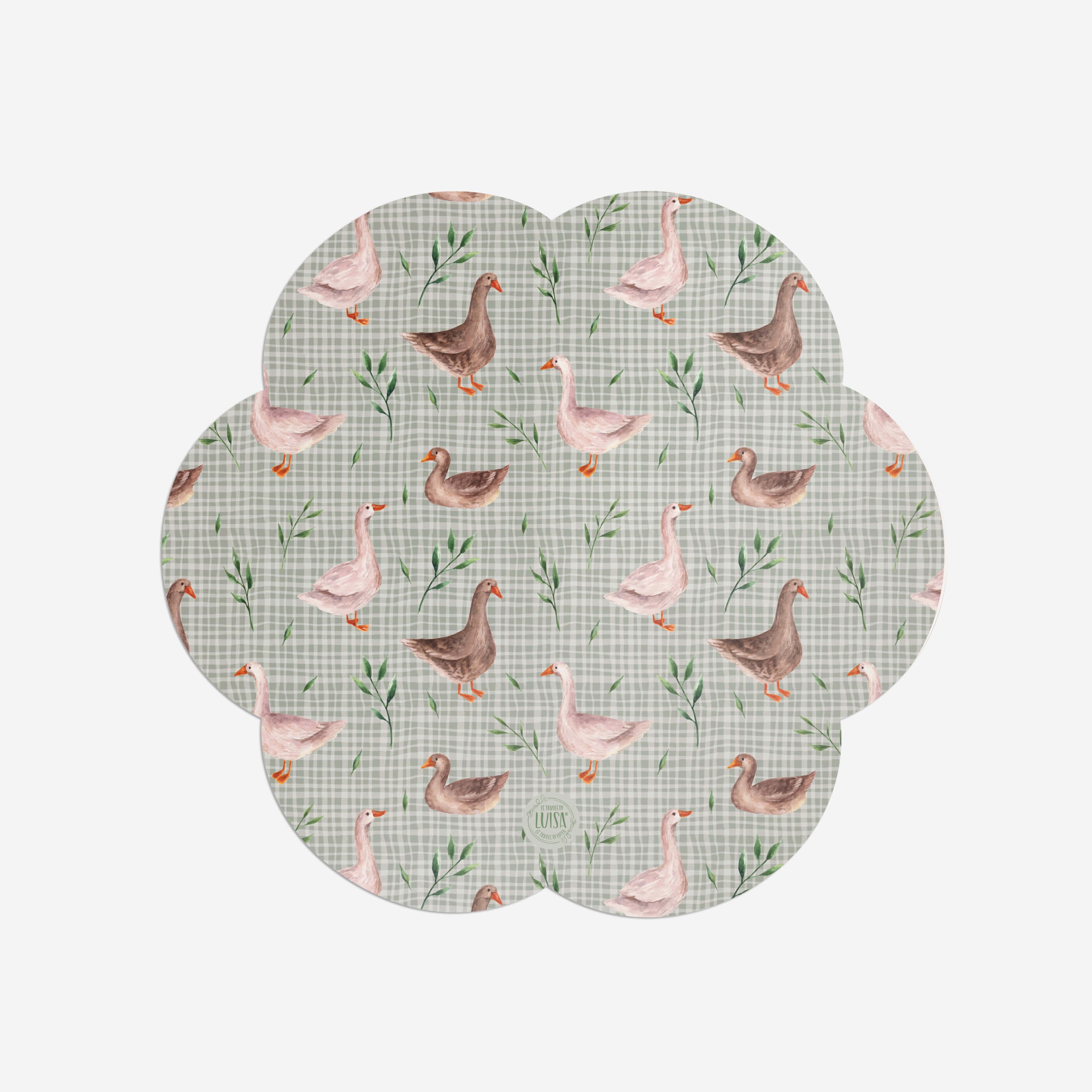 Scopri il calore rustico e la bellezza naturale del nostro set di sottopiatti "Gentilezza campestre". Ogni pezzo è abbellito da un'incantevole scena di oche in cammino, riprodotte con precisione e cura, su un delicato sfondo a quadretti verdi e bianchi, evocando un'atmosfera serena e rustica.