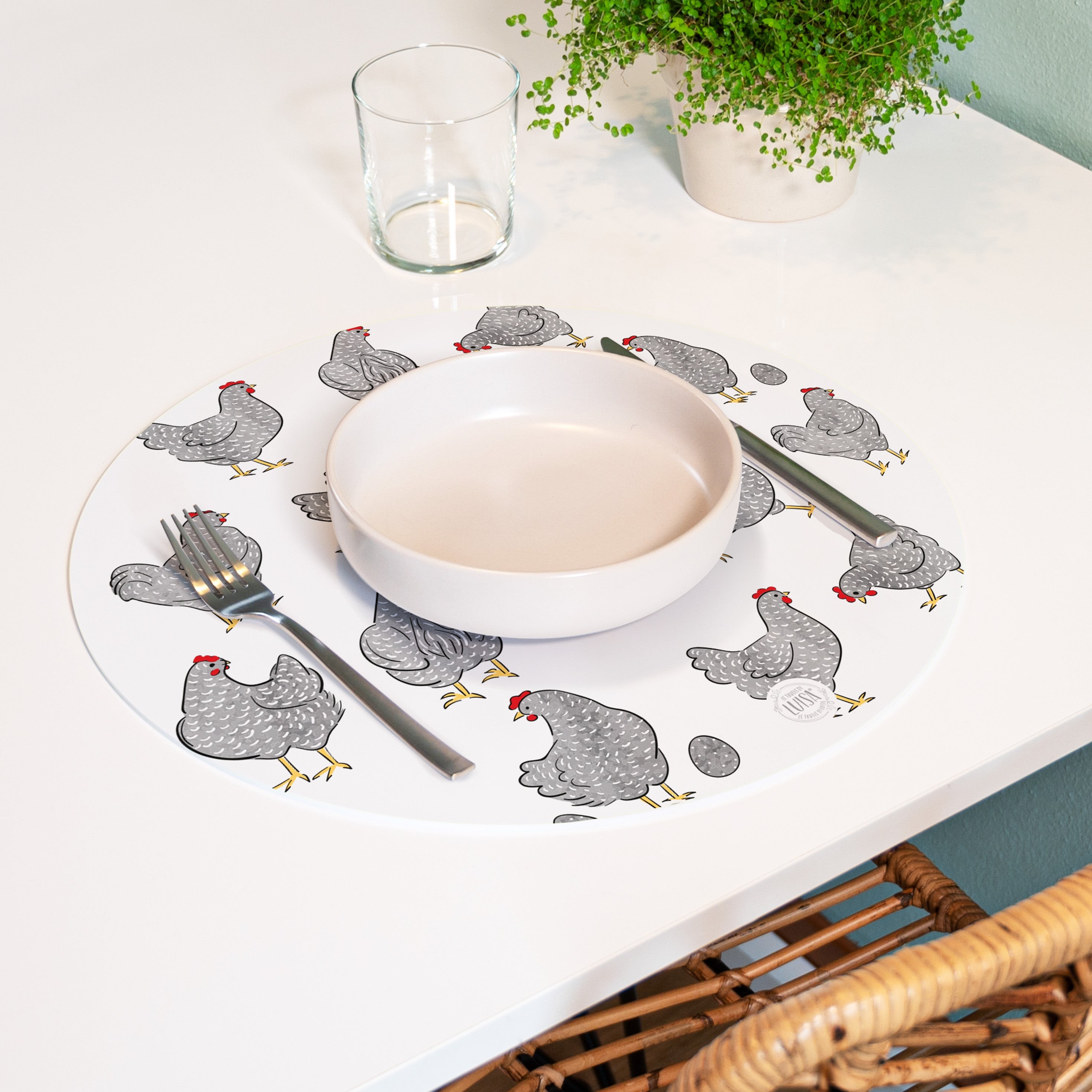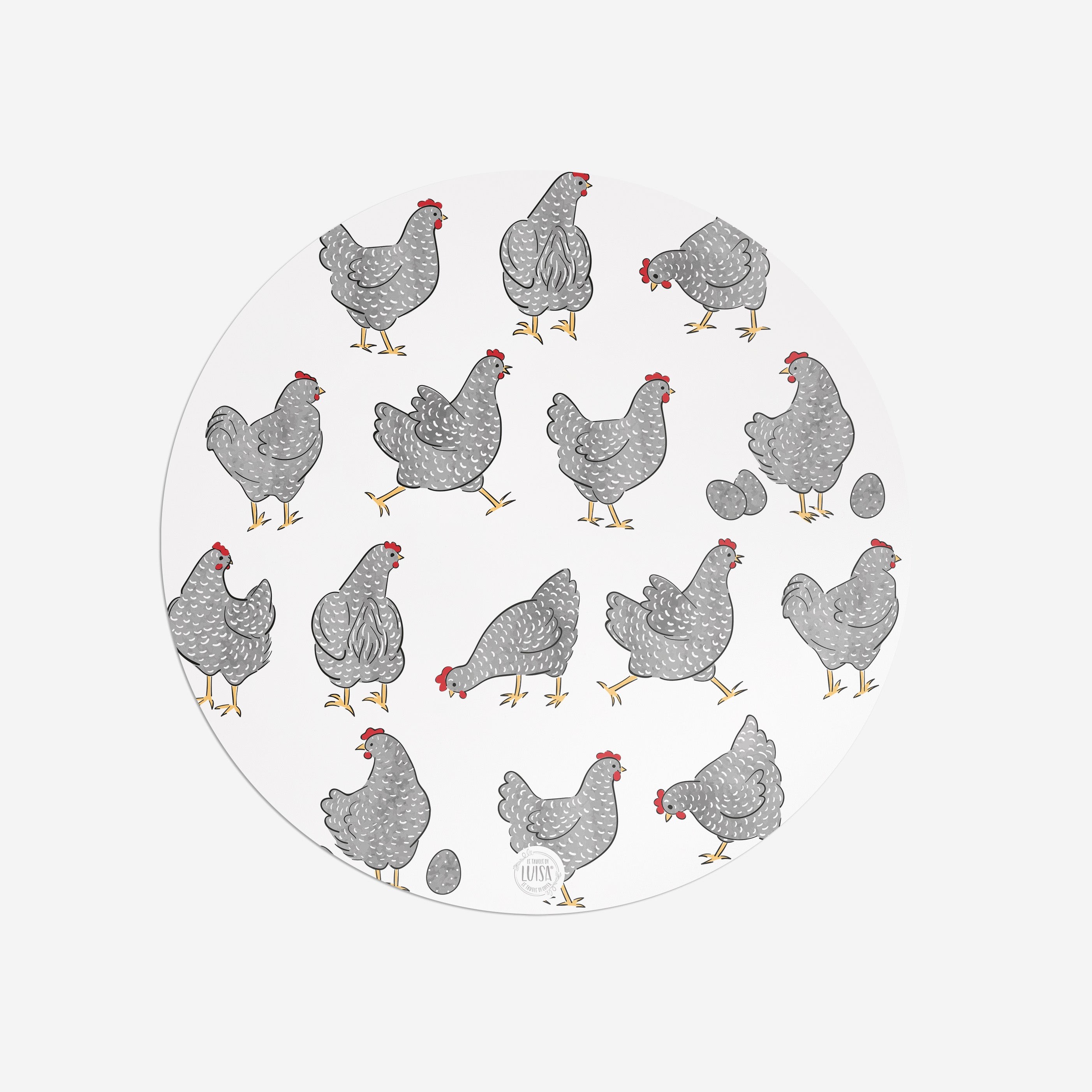 Il grigio delle galline e il bianco dello sfondo rendono questi sottopiattiperfetti per qualsiasi allestimento, dal più neutro a quelli più colorati.