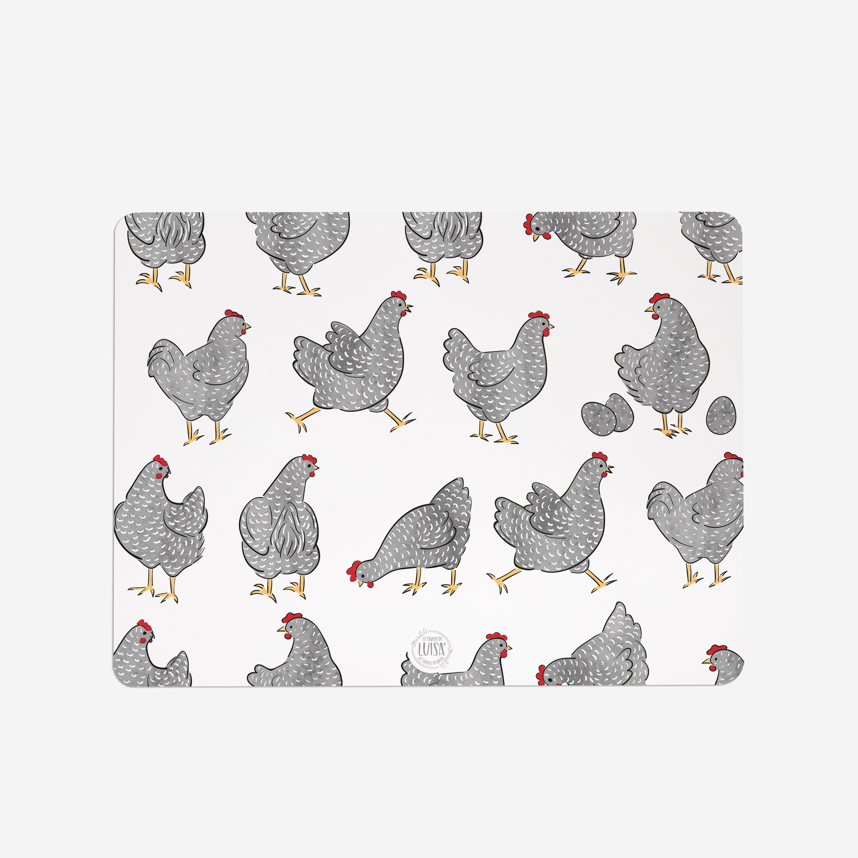Il grigio delle galline e il bianco dello sfondo rendono questi sottopiattiperfetti per qualsiasi allestimento, dal più neutro a quelli più colorati.