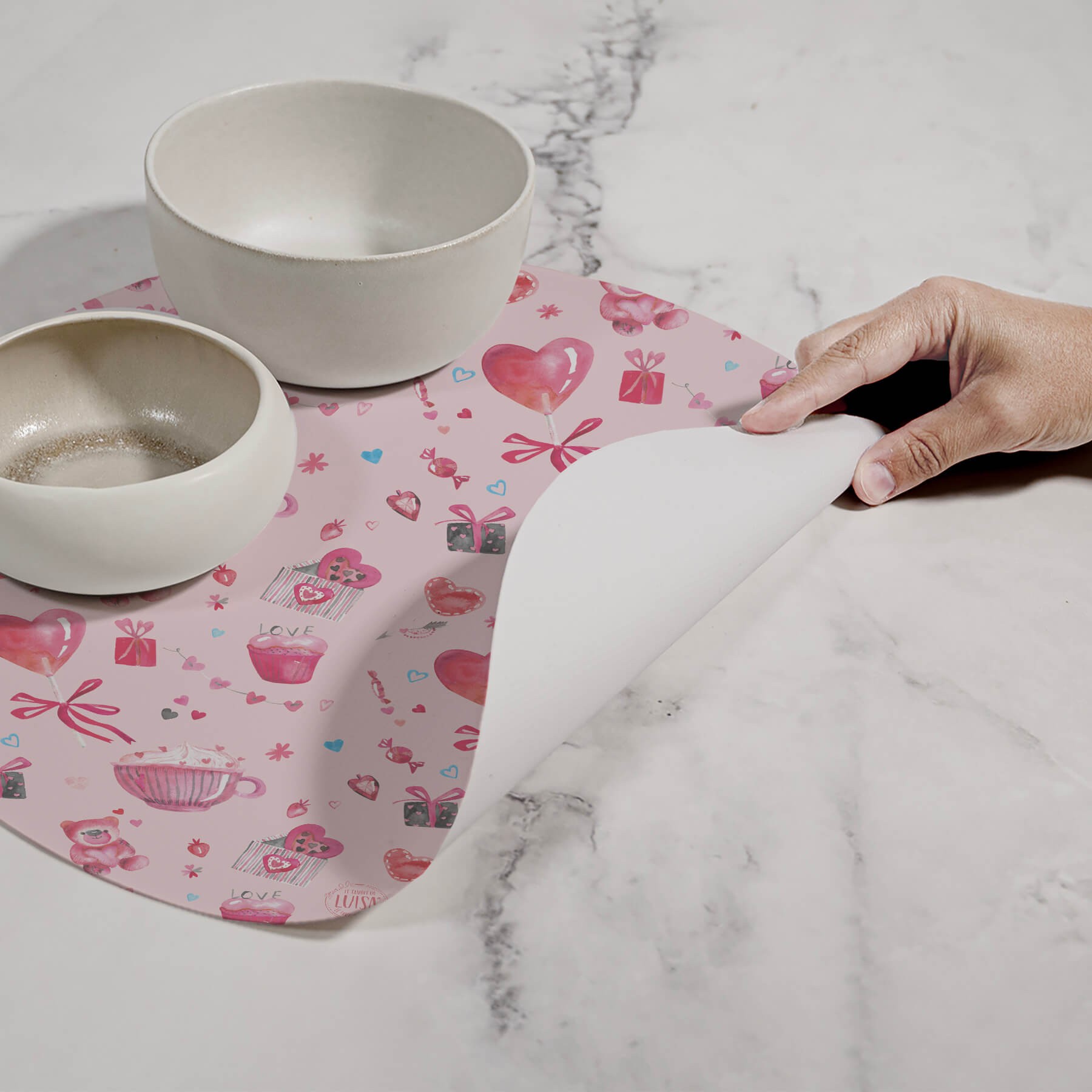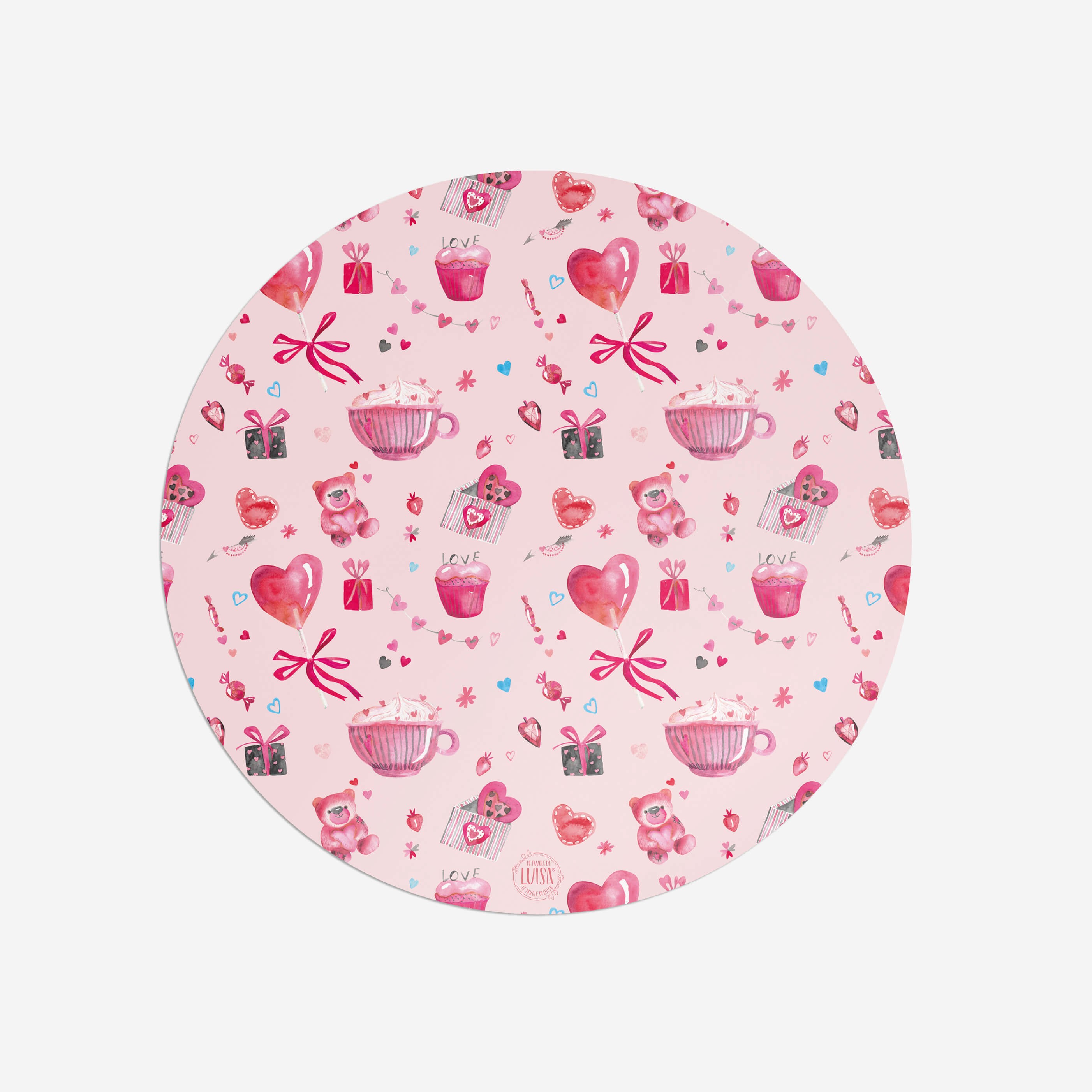 Con un affascinante pattern su fondo rosa che include simboli romantici come lecca-lecca a forma di cuore, orsetti di peluche, tazze di cioccolata calda, scatole regalo e cupcake con la scritta "Love", queste tovagliette sono l'ideale per rendere ogni momento speciale ancora più romantico.