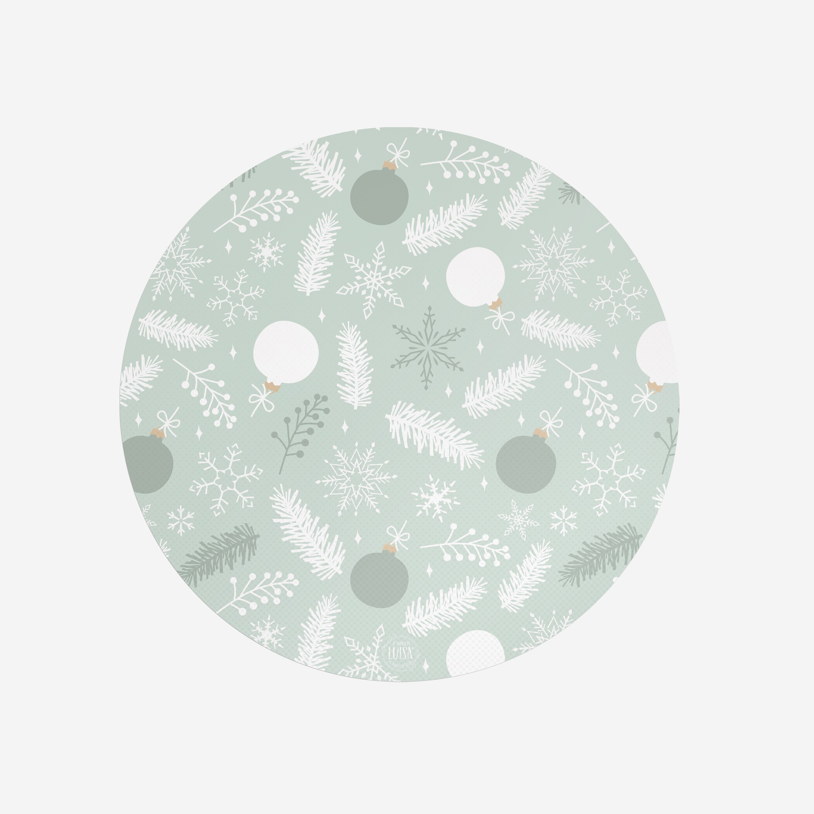 Illumina le tue celebrazioni natalizie con il set di tovagliette "Decorazioni Natalizie". Queste tovagliette presentano un delicato motivo natalizio in cui rami d'abete e decorazioni bianche si intrecciano su uno sfondo verde chiaro, creando un contrasto elegante e accattivante.