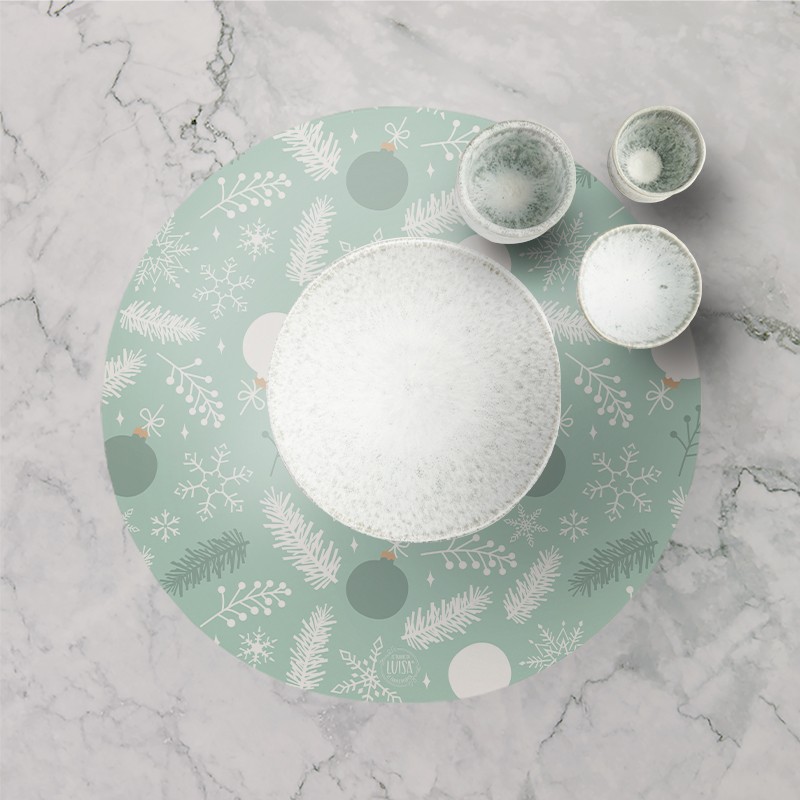 Un accorgimento semplice che però trasformerà la tua tavola in una piccola opera d'arte natalizia. I rametti d'abete e le decorazioni bianche richiamano l'atmosfera del Natale, mentre lo sfondo verde chiaro crea un'esperienza accattivante. L'atmosfera sarà unica, con un senso di festa e tradizione.