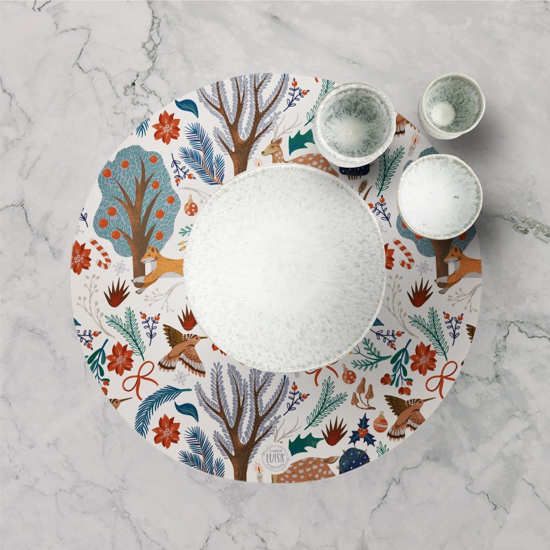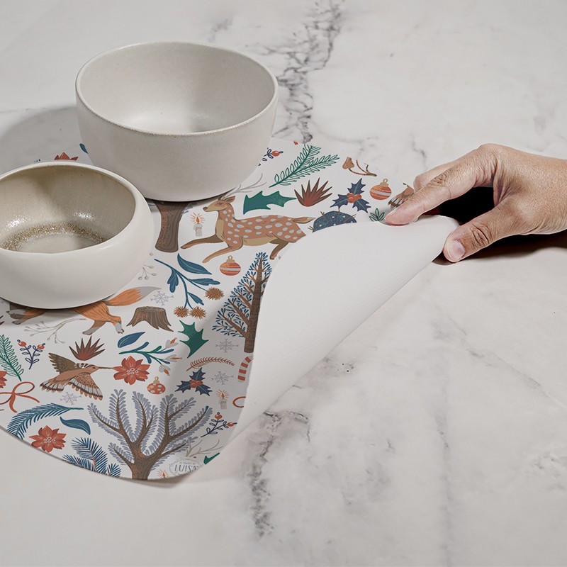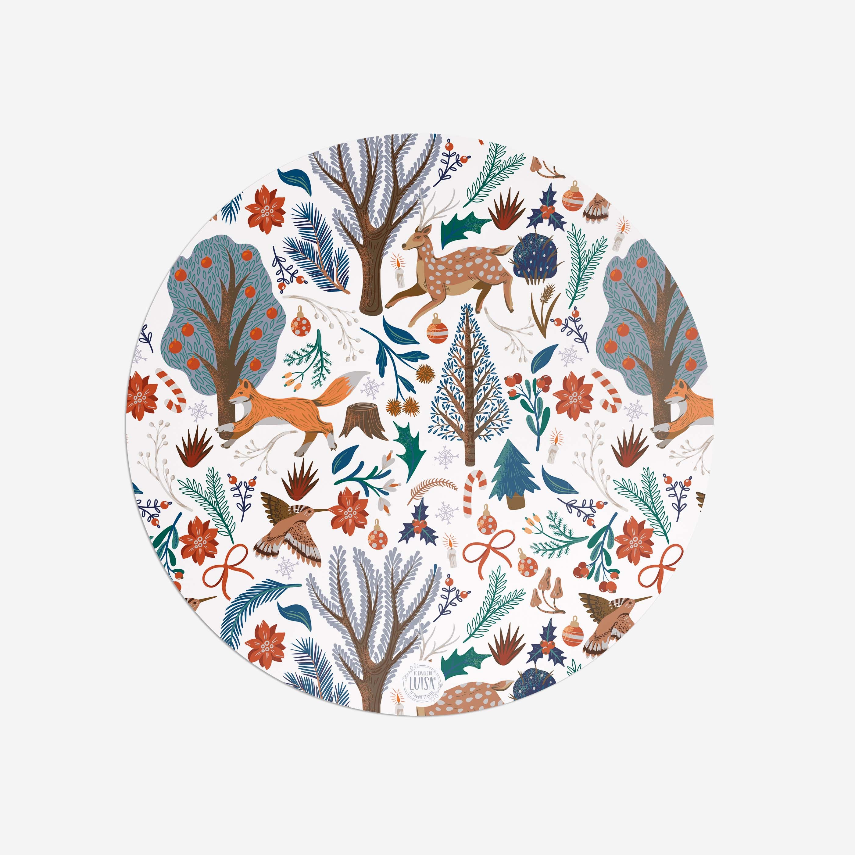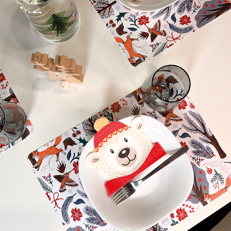 Porta la gioia delle festività alla tua tavola con il set di tovagliette "Bosco in festa". Il design unisce elementi naturalistici, come alberi e animali invernali, a simboli natalizi come fiocchi di neve e bastoncini di zucchero, creando un'atmosfera unica e colorata.